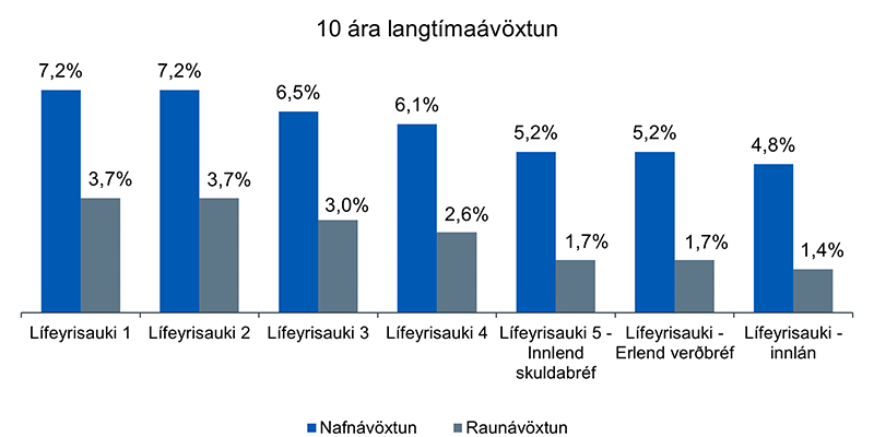 Þegar horft er á lengri tíma sparnað eins og séreignarsparnað er mikilvægt að minna sig á að ávöxtun til lengri tíma er það sem mestu máli skiptir og ekki er óeðlilegt að það verði nokkrar sveiflur á milli ára. Langtímaávöxtun Lífeyrisauka hefur verið góð en á myndinni hér fyrir neðan má sjá ávöxtun á ársgrundvelli til 10 ára m.v. 31.12.2022. 10 ára nafnávöxtun er á bilinu 4,8% til 7,2% og raunávöxtun 1,4% til 3,7%. Aðalatriðið er að meðalávöxtun sjóðsins til lengri tíma er mikilvægari en sveiflur í ávöxtun til skamms tíma.