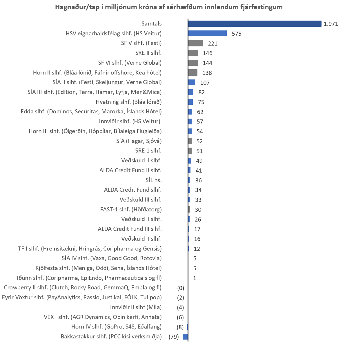 Frá árinu 2008 hefur eignaflokkurinn, innlendar sérhæfðar fjárfestingar í heild sinni, skilað um 1.971 milljón króna hagnaði af heildarfjárfestingu upp á um 4.099 milljónir króna. Á myndinni hér að neðan má sjá árangur einstakra fjárfestinga Lífeyrisauka sem eru nýhafnar, komnar langt á veg eða lokið (dökk gráu súlurnar).